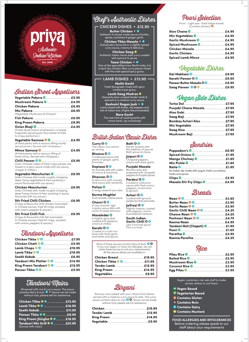 While it doesn’t offer a modern or fine-dining aesthetic, the warm, inviting interior and the aromatic kitchen more than make up for it. Whether you're a connoisseur of Indian food or simply craving a well-prepared curry, this place is worth a visit. For quality, flavour, and value, Priya Authentic Indian Kitchen Menu earns high marks in all categories.