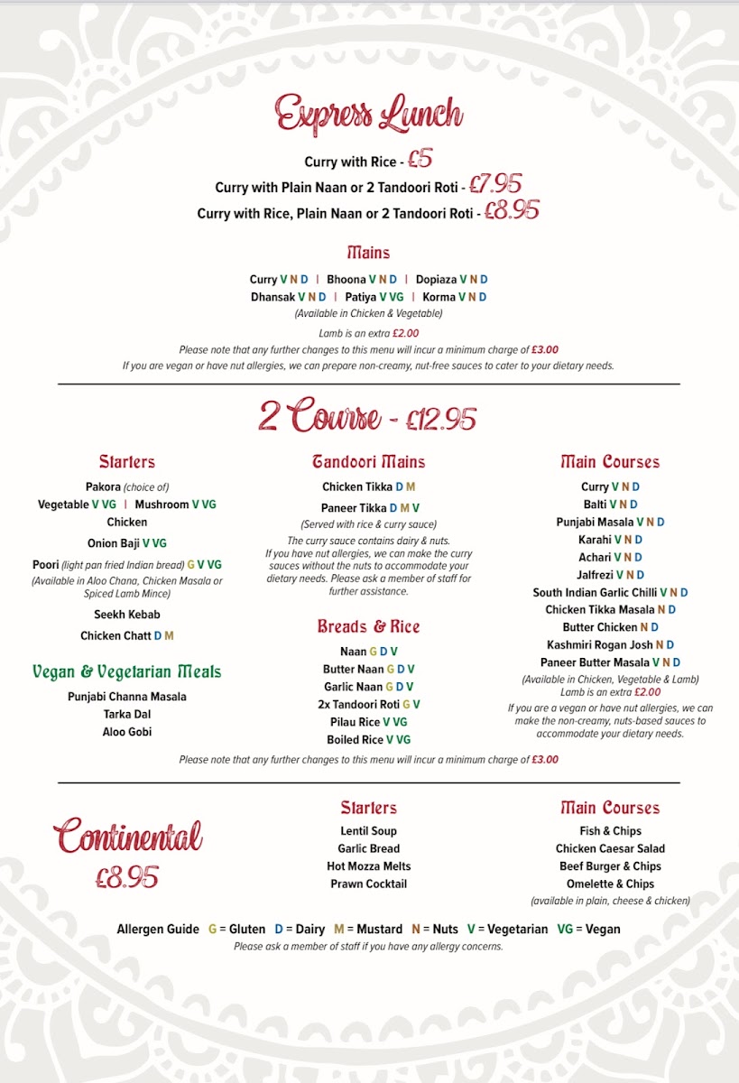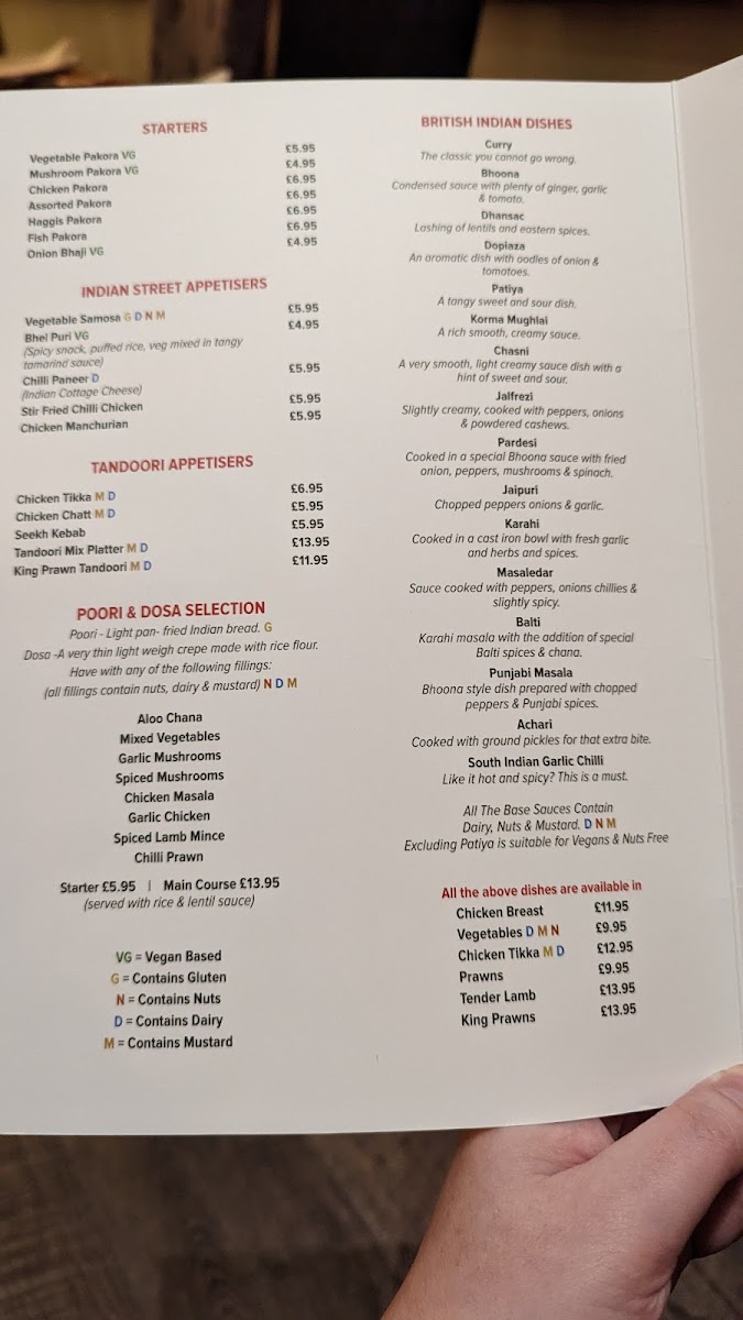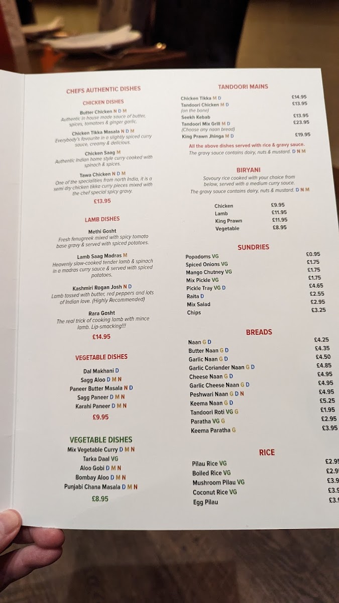From the outset, the service feels personal and attentive. The staff are happy to recommend dishes based on taste preferences or spice tolerance-demonstrating both knowledge and genuine hospitality. The menu is diverse yet well-curated, balancing familiar favourites like Chicken Tikka Masala and Lamb Rogan Josh with more regional offerings, including South Indian dosas and Goan-style prawn curry. Portions are generous, and the presentation, though traditional, is thoughtful and appetising.